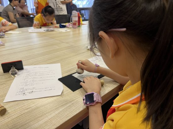 紧接着,活动进入第二阶段——体验非遗文化。在博物馆的精心安排下,参与者们有幸体验了金石泉拓这一传统技艺。通过观看视频课程,大家初步了解了泉拓的制作流程与技巧。随后,在陈馆长的现场辅导下,学生们纷纷动手实践,体验了从选材、研磨到拓印的全过程。一张张精美的拓片在大家的努力下诞生,并被盖章入塑合,作为此次活动的纪念品带回家。